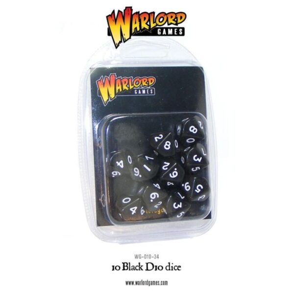 This pack contains ten black ten-sided dice (D10) with white numbers.