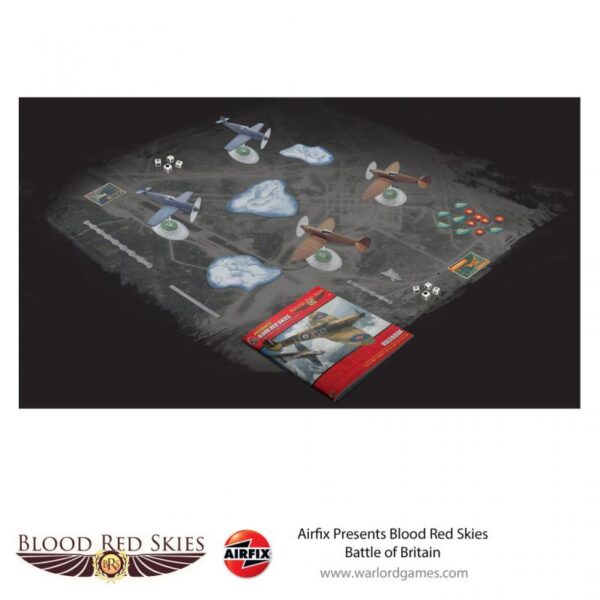 The Airfix Presents Blood Red Skies box set comes complete with everything you need to get playing the game, and four aircraft: two Supermarine Spitfire Mk IIs and two Messerschmitt Bf109-Es, in 1:72 scale.