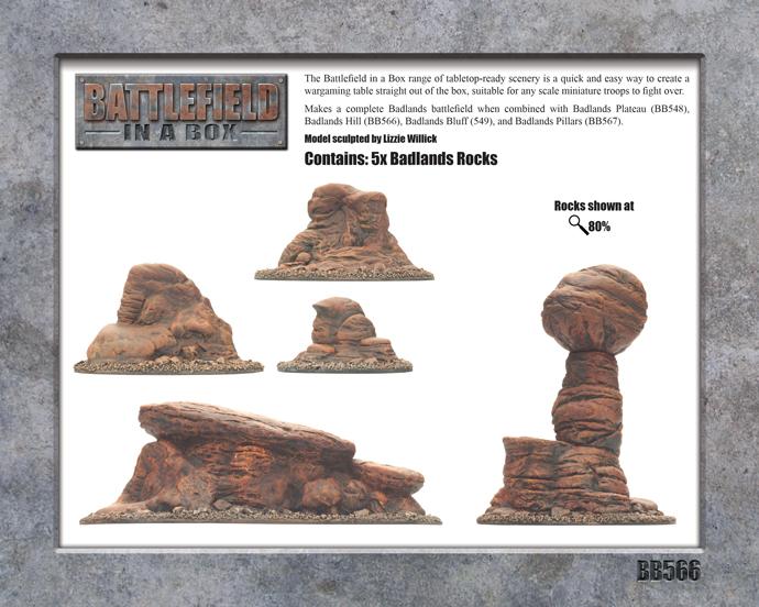 Centuries of erosion by wind and water have carved stunning stone monuments out of the clay-rich earth of the Badlands. Large flat-topped plateaus and bluffs tower across the landscape, granting commanding views to those who scale their towering heights. Clumps of eroded rocks dot the stark region providing cover to advancing units or concealing dangers from unsuspecting victims.