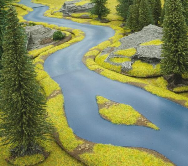 River Expansion: Island contains three river sections; a river with a small island in the middle, a lazy curved section and abig bend curve section. Included with the pre-painted rivers is a small bag of Green Static Grass allowing you can flock the river banks to match your battlefield, or you may wish to use one of GF9’s many other Hobby Scenics to blend the piece in seamlessly with your own terrain collection and models. These pieces are cast in a flexible material to withstand the rigors of gaming.