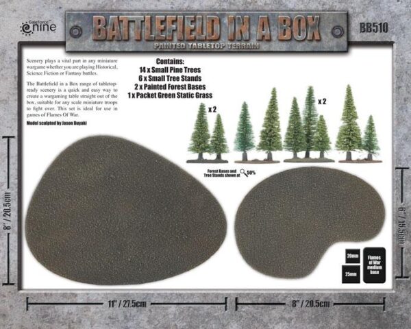 Small Pine Wood contains two pre-painted forest terrain bases, six small tree stands, fourteen small model pine trees and a small bag of Hobby Scenics Green Static Grass. One base measures 11″ long and 8″ wide while the other base is 8″ long and 6” wide. There are three tree sizes in the set; 2″ high, 3¼” high and almost 4″ high.