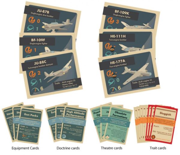 - 6 aircraft cards: [Bf 109F ‘Franz’ single-engine fighter, Bf 109K ‘Karl’ single-engine fighter, Ju88C Twin-engine heavy fighter, Ju87B ‘Stuka’ single-engine dive bomber, He111H Twin-engine medium bomber and the He177A ‘Greif’ four-engine heavy bomber]