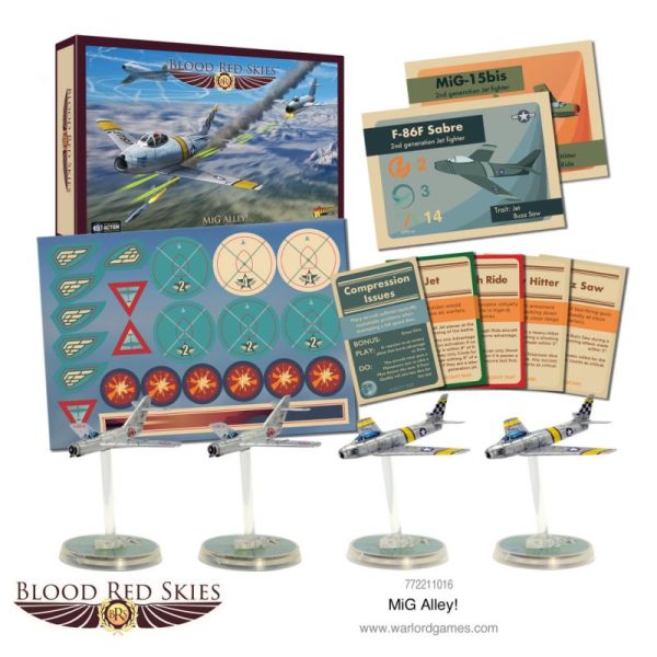 The Mig Alley set contains all the aircraft cards, pilot discs, traits doctrine and equipment cards you need to take your games of Blood Red Skies in to the Jet Age!
