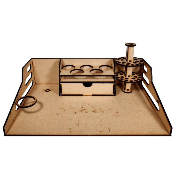 The kit can be assembled to accomodate dropper bottle or flip top paints. On the left and right there are spaces for the brush stand and a water put and the kits has been designed for either left or right hand orientation.