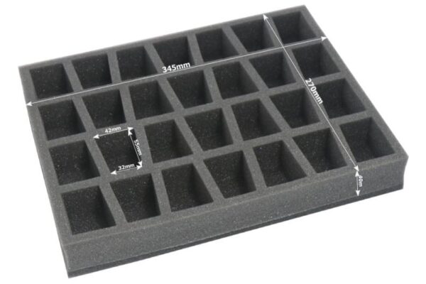 The foam tray has dimensions of 345mm x 270mm x 50mm and fits perfectly to old plastic miniatures cases.