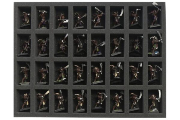 The foam tray has dimensions of 345mm x 270mm x 42mm and fits perfectly to old plastic miniatures cases.