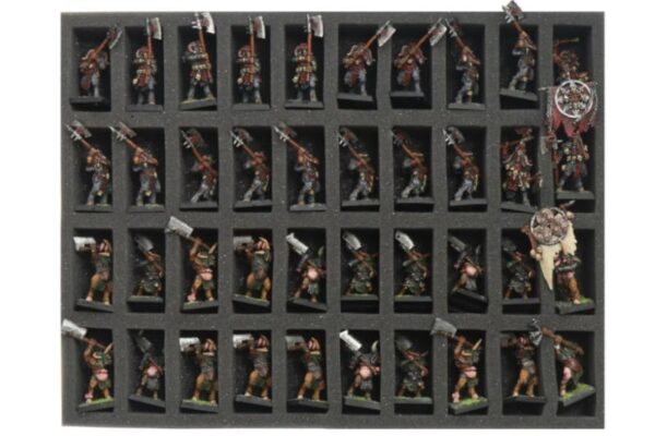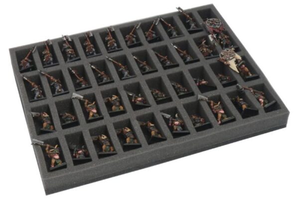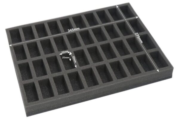 The foam tray has dimensions of 345mm x 270mm x 35mm and fits perfectly to old plastic miniatures cases.