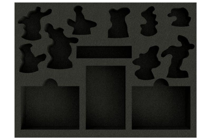 In this box, you will find a dedicated space for every single miniature, slots for two card decks, dice and tokens.