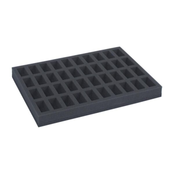 The presented product is a Full-size foam tray for storing and carrying 40 regular miniatures on 20mm or 25mm bases.