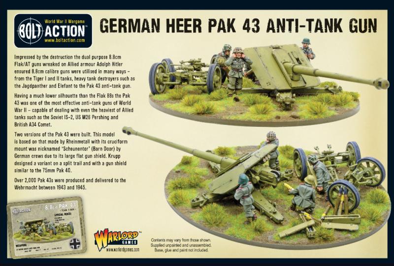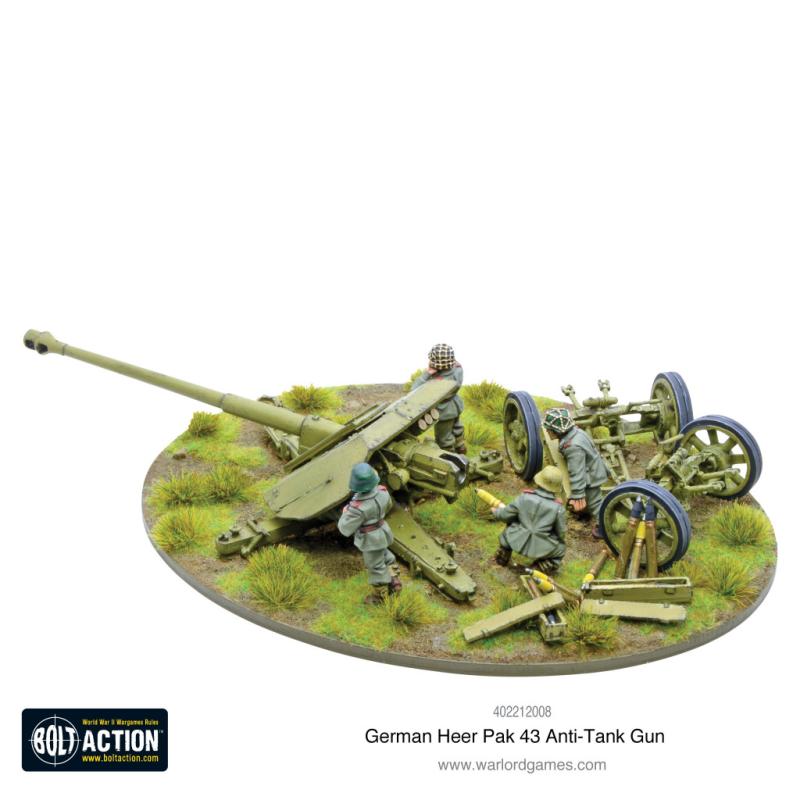 This stunning 28 mm model contains all the parts required to build 1 metal Pak 43 anti-tank gun with its 5 man crew, plus its Bolt Action data card (base not included).