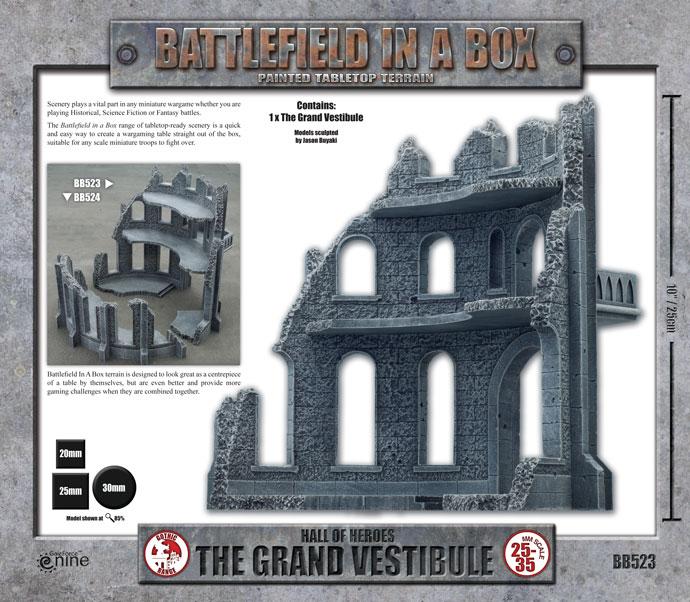 Hall of Heroes: The Grand Vestibule is the massive ruined entrance section of a circular tower, rotunda or acropolis. From end to end the remnant is just over 11 inches wide and is 10 inches high at its tallest point. The two story structure opens out onto a small balcony above the doorway. The Grand Vestibule may be combined with other pieces in the Hall of Heroes collection to mark out a larger ruined building or stands alone as an imposing piece of terrain.