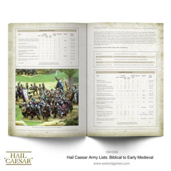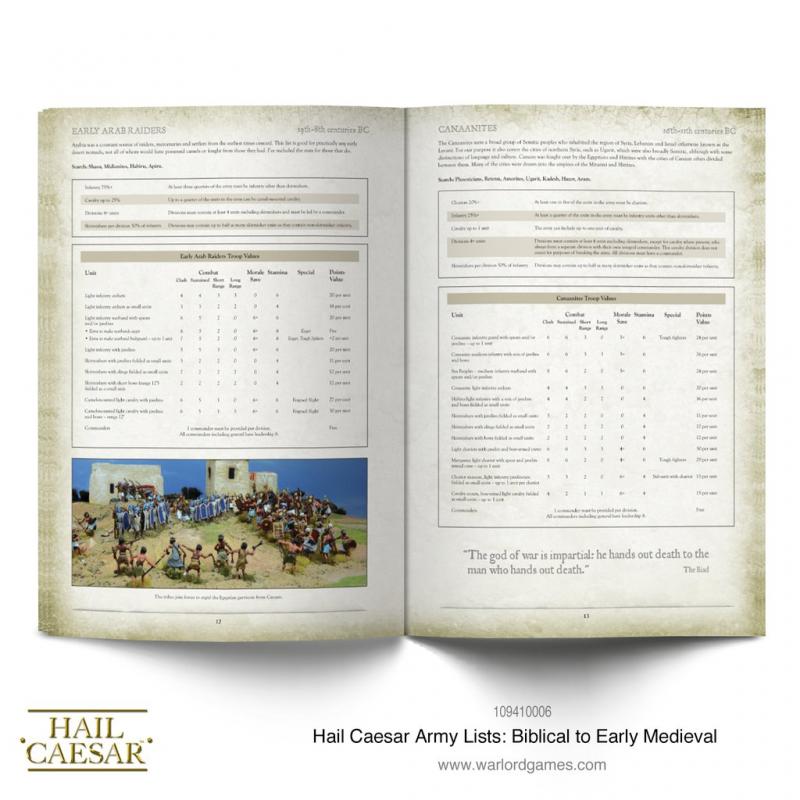 This volume consolidates Hail Caesar army lists from the dawn of civilization up until the early thirteenth century into a single volume. These army lists bring special rules and army compositions that are not necessarily found within the main Hail Caesar rulebook, thus allowing players to use a list that pertains to their personal collection of miniatures. Within, you’ll find no fewer than 123 army lists ranging from around the 30th Century BC up to the early 13th Century AD. Army lists included: