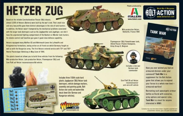 The mid-production Hetzer, Late production Hetzer, the fear-instilling flammpanzer 38(t) and the extremely rare 2cm FlaK auf Hetzer reconnaissance/AA. This ZUG box set is the perfect opportunity to create the different variants that the Germans have developed during the war. Need a dedicated anti-tank? Use either of the mid or late production Hetzers, too many infantry on the field? Flammpanzer! Pesky planes harassing your forces? Bring the 2cm FlaK auf Hetzer reconnaissance/AA and blow them out of the sky!