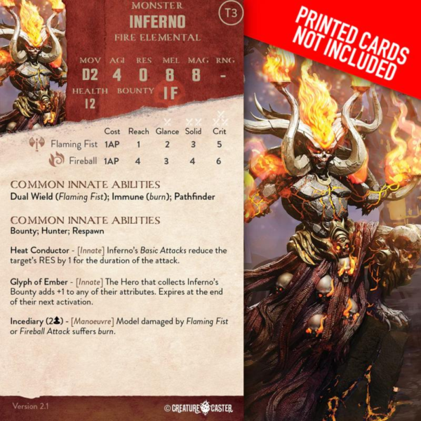 Inferno is a level 2 monster who has both ranged and melee attacks, and can inflict the burning condition on heroes.
