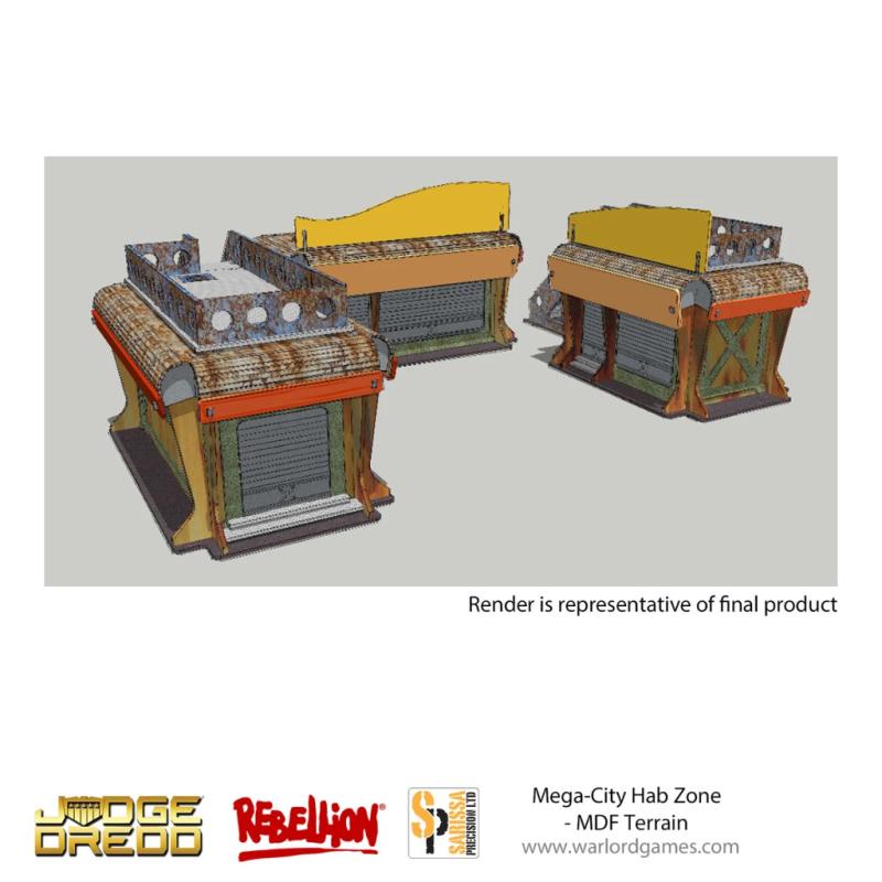 Lend your battles in Mega-City One an extra level of authenticity with the Mega-City Hab Zone. These three buildings could represent any number of vendors plugging their wares – synthetic caffeine perhaps, or maybe something more sinister – to the massed citizenry of Mega-City One. They’ll also provide great sources of cover in a firefight!