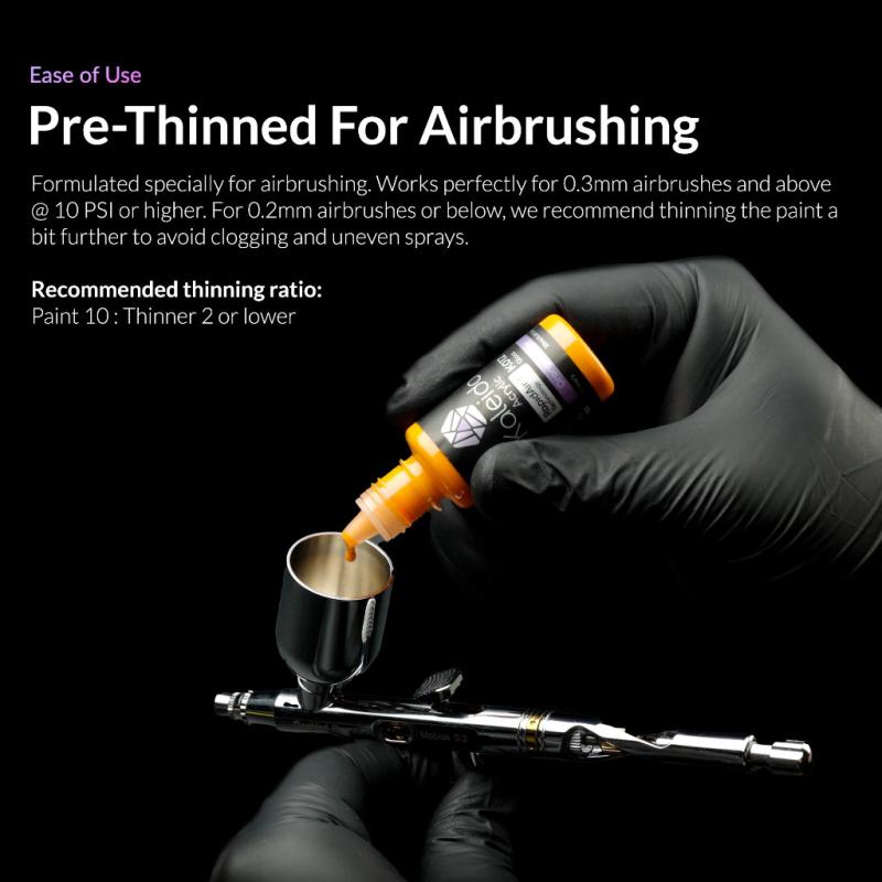 • Kaleido paints are pre-thinned water-based acrylics, ready for use straight from the bottle with 0.3–0.5mm airbrushes.