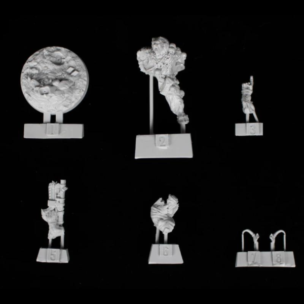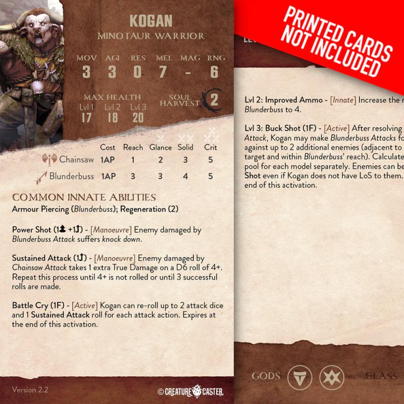 Kogan’s signature weapons, a blunderbuss and bandsaw, are an extension of his very being. With the blunderbuss, he can unleash devastating short-ranged firepower, turning the battlefield into a storm of chaos with each shot. In close combat, his bandsaw cleaves through his foes with brutal precision, leaving a trail of destruction in its wake. Kogan’s mastery of these dual weapons allows him to excel as both a melee aggressor and a short-ranged damage dealer, making him a versatile and formidable combatant.