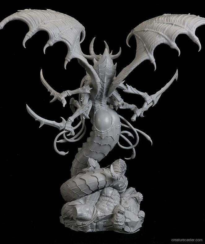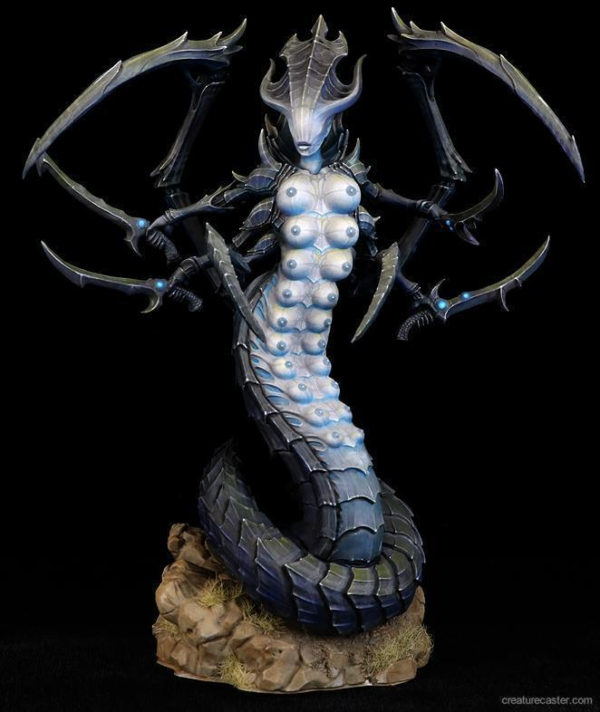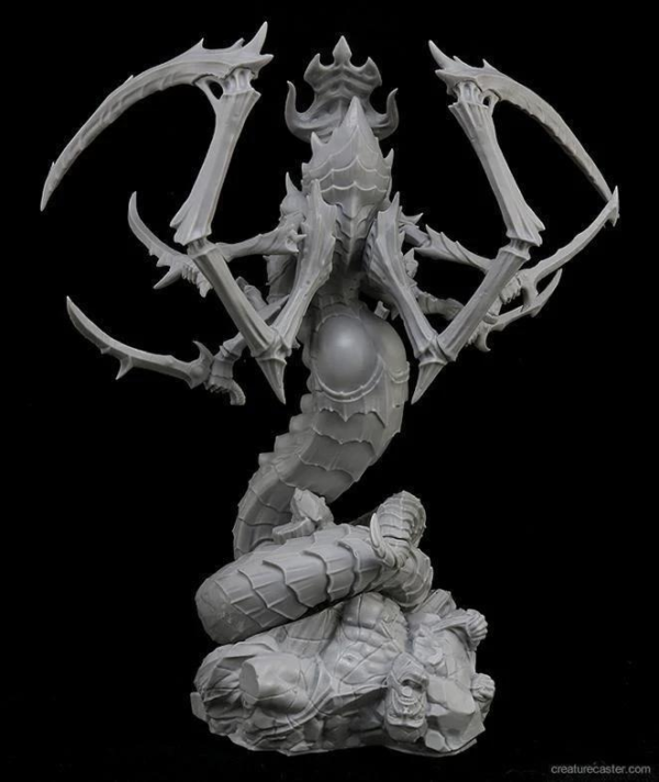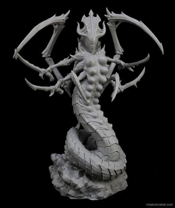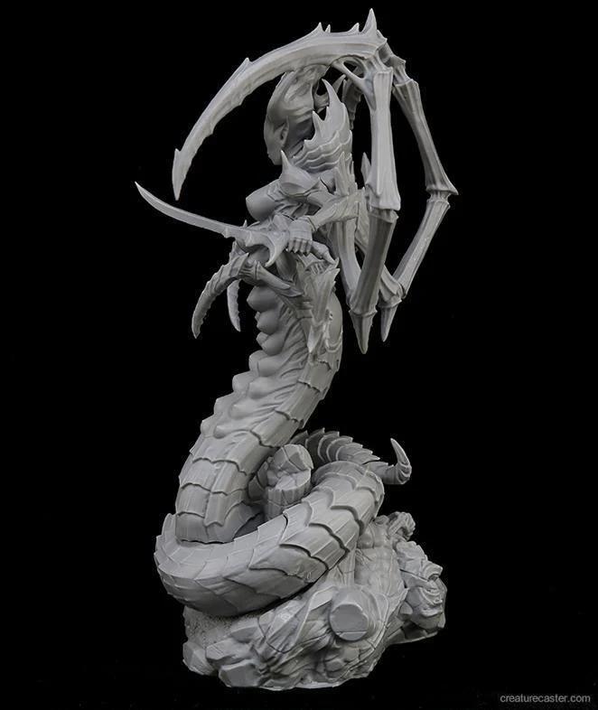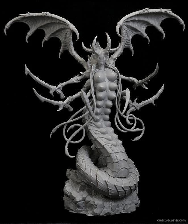 The Lady of Depravity is a devotee of the flesh, and craves the sensation of touch. Through countless dark bargains she has transformed her body to suit this purpose. For her, it is not enough to simply move. Instead she embraces the ground with her tail, feeling each grain of sand upon her scales. She caresses the wind with her wings, reveling in the cold bite across her delicate skin. It is not enough just to fight. Instead she grasps her victims tight, feeling their struggles like an electric current across her epidermis. She plays with her victims, allowing them to land blows against her that explode in a riotous mosaic of sensation across her body. She slits and rends their flesh, her blades impaling them in a perverse union–two forms bound together in blood and viscera. All of this is performed with a surgeon’s skill, with her often choosing not to strike mortal blows.