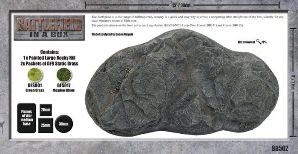 Large Rocky Hill contains one pre-painted terrain piece and a small bag of Hobby Scenics Green Static Grass. The hill measures 15″ long and 8″ wide. It peaks at 2″ at its highest point.