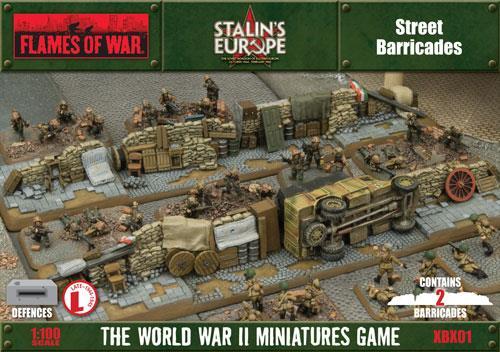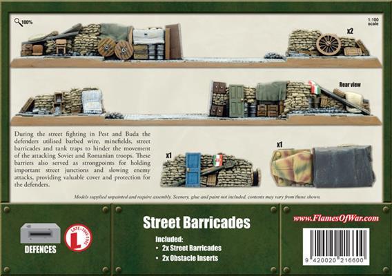 with two street barricades & obstacle inserts. During the many battles for cities on the Eastern Front the defenders used improvised barricades to block access to the streets and thoroughfares. These were used to slow the momentum of the attackers and as an anchor point for the defence. The barricade would slow or stop any enemy armour, making them vulnerable to attacks from the surrounding buildings.