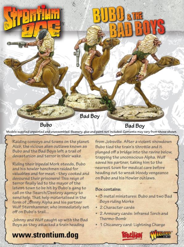 - 3 metal miniatures: Bubo and two Bad Boys riding Morks