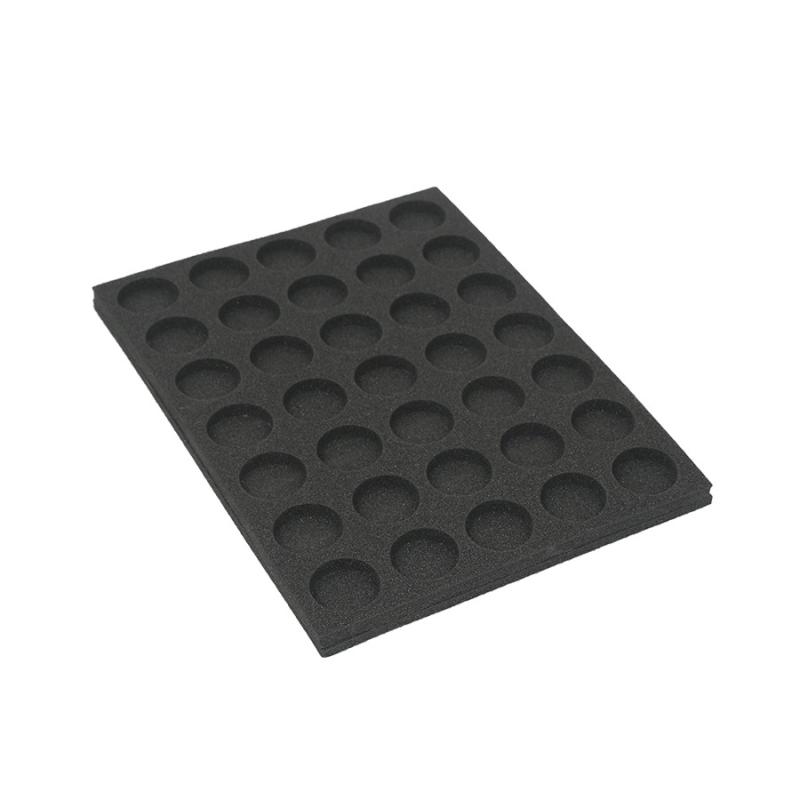 The foam tray has 35 circular slots of 30,5mm diameter which holds the miniature bases securely.