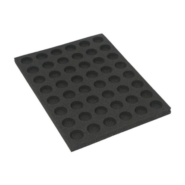 The foam tray has 48 circular slots of 23,5mm diameter which holds the miniature bases securely.